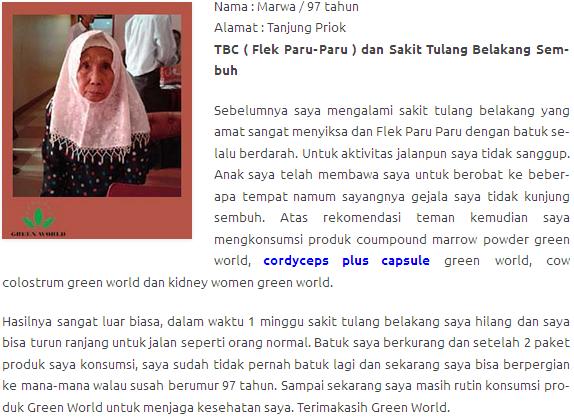 Jelas Cordyceps Plus Capsule Pengobatan Tradisional Flek Di Paru Paru Terbaru ini memang produk herbal berkualitas yang memiliki khasait yang sangat luar biasa. Perusahaan Green World Global adalah perusahaan yang memproduksi produk produk herbal berkualitas yang tinggi akan khasiatnya untuk membantu proses penyembuhan berbagai penyakit.